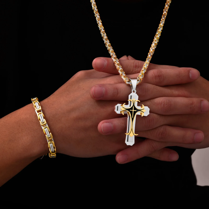 This multilayered necklace with the Latin cross of the Christian Trinity represents the sacred union of the Father, the Son, and the Holy Spirit. Its unique design not only brings style but also symbolizes spiritual strength and connection with God.✝️